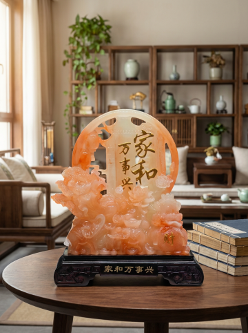 工笔风雕琢,重拟物与浮雕结合,木雕质感基座,中式古典韵味浓厚,寓意家和万事兴,温馨舒适,尽显传统节日祝福。