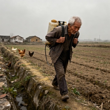 背景是层峦叠嶂的青绿色山脉,山间薄雾缭绕,远处田野呈现柔和的色块,阳光透过枝叶洒下斑驳的光影,整体色调温暖清新,画面充满丰收的治愈感