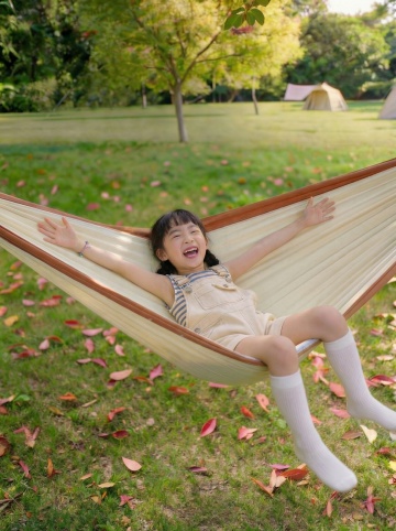 阳光透过茂密的绿色树叶洒下斑驳光影,在开阔的绿色草地上,布置着一个米色帆布帐篷和一个带遮阳棚的露营帐篷,帐篷周围摆放着原木色折叠桌椅,桌上铺着格纹餐布,旁边散落着几个彩色靠垫和一本翻开的书,整体呈现出自然、宁静、舒适的户外露营氛围,高清晰度,写实风格,温暖色调,柔和光线,丰富的细节纹理。