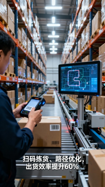 一个现代化的智能仓库内部,具有工业科技感的设计风格,主色调为蓝色和灰色,搭配白色灯光营造出明亮通透的氛围。仓库内采用高顶设计,金属框架结构的货架整齐排列,货架上存放着各种规格的箱子和物品。中央区域配备有自动化的物流设备和机器人,地面上画有黄色的引导线。天花板上安装有长条形的LED灯带和监控设备,墙壁上和货架之间的电子屏幕显示着实时的库存数据和操作信息。整个空间呈现出高度智能化、高效运作的未来感仓储环境,光影效果突出金属和玻璃材质的冷硬质感,同时通过蓝色的科技光晕增添现代感和专业度。