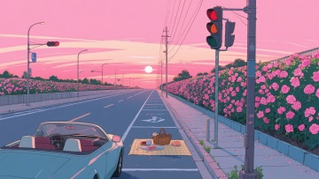 二次元日漫,城市马路,晚霞,约会,氛围浪漫、回忆,浅粉色,细节丰富,构图夸张,不要人物,16:9,生成二张