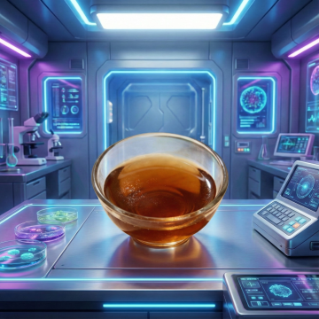 一个透明玻璃材质的圆形容器,内部装有金黄色液体,液体表面有细小气泡,容器周围连接着多个大小不一的透明玻璃球体,球体内部也有金黄色液体和气泡,整体悬浮在纯白色背景上,高光泽,强反光,超写实质感,清晰的边缘和细节,柔和的高光,精致的玻璃纹理,液体的流动性和透明度表现极佳。
