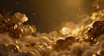 **视觉细节:** 云朵蓬松柔软如锦缎,呈现**朱红、鎏金与暖橘色**的瑰丽渐变。一道神圣柔和的顶光从云洞洒下,在云层边缘形成**璀璨的丁达尔光晕**。