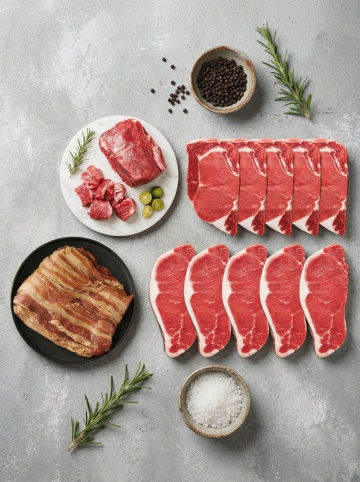 一位穿着黑色围裙的男性厨师,双手正握着一把锋利的厨刀,在木质砧板上精准地切割新鲜的红色生肉块,砧板上和旁边的竹篮里也堆放着多块纹理清晰的肉块,整体画面采用暖色调自然光摄影风格,光线从斜上方照射,突出肉块的鲜嫩质感和厨师手部的肌肉线条,背景为简洁的深色木质墙面,营造出专业、质朴且充满生活气息的厨房环境,高分辨率细节清晰,无任何文字和水印。