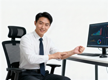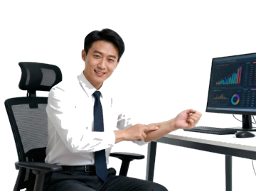 A young, healthy Chinese professional sitting upright in a modern office chair. His/Her hands are gently but completely covering ears, with index fingers poised to snap down behind the head (the starting pose of Ming Tian Gu). He/She has a serene, awakening smile. Wearing smart-casual office attire. On the浅原木色 (light wood) desktop in front: an open tablet showing a morning schedule and a glass of clear water. A stylish notebook and a pen are stacked on a folder. Pure white background.