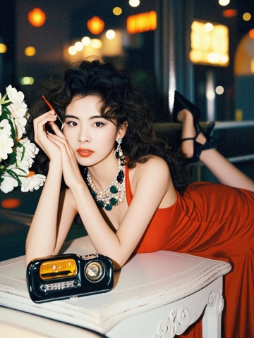一位穿红裙女性,卷发蓬松有光泽,妆容惊艳,红唇,精致眼妆,姿态慵懒,手托腮,持黑色高跟鞋。背景带朦胧怀旧夜景,色调暖黄复古,营造80年代港风电影感。 #百变造型实验室