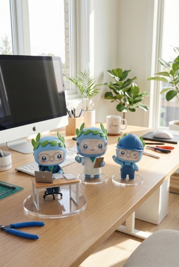 生成一个模型玩具,手办放置在电脑桌上,配有一个圆形透明亚克力底座,比例3:4