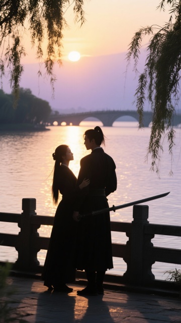 国潮风与水墨意境交融,汉服女子执伞立于湖畔,夕阳映水,芦苇轻摇,飞鸟掠空,光影流动间尽显古典优雅与静谧浪漫。