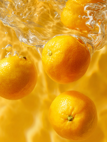 超写实风格摄影,阳光下新鲜橙子在水中溅起晶莹水花的场景,前景有完整的橙色橙子和切开的橙片漂浮在水面上,水珠四溅,周围环绕翠绿的橙树叶,背景是蓝天白云与远山,整体色调以橙色、绿色和蓝色为主,光影明亮通透,细节清晰,富有活力与清爽感,不同造型的橙子分布在画面各处,营造出生动自然的水果场景氛围。