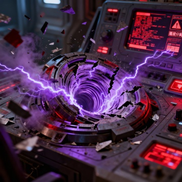赛博朋克风3D场景,金属质感控制台裂开紫色能量漩涡,霓虹红光与电弧交织,粒子飞溅,工业感与科技感碰撞,冲击力十足。