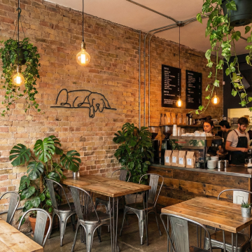 温暖复古的餐饮场景背景,木质桌面纹理清晰,表面有柔和的灯光反射,上方悬挂着数个暖黄色灯泡,灯光营造出温馨朦胧的氛围,背景是砖墙与木质结构的结合,整体色调为暖棕色与暗黄色,光线柔和且具有层次感,画面聚焦于桌面和灯光,背景适当虚化,营造出舒适惬意的用餐环境基调。