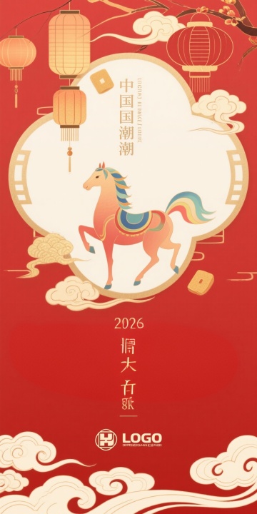 国潮风插画,剪纸窗格框景,工笔马跃山巅,水墨山水与鎏金祥云交织,红底喜庆,烟花点缀,尽显中式古典年味。