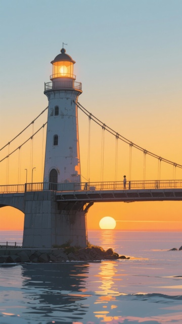 二次元,桥边灯塔,氛围回忆,暖洋色,不要人物,细节丰富,9:16,生成二张