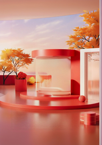 中国风3D渲染展台设计,画面中央放置一个双层圆形展台,底层为白色带有金色回纹装饰,上层为红色台面并带有金色包边,展台后方是一个金色边框的圆形镂空窗,窗后背景为连绵起伏的山峦,左侧有金色镂空窗格和盛开的白色玉兰花枝,右侧有玉兰花点缀,整体画面采用深蓝、金色和米色的配色,远山呈现深蓝与米色渐变,近处山峦为深蓝色并带有金色轮廓线,天空为浅蓝色,点缀着白色祥云和飞鸟,整体风格典雅大气,光影柔和,具有层次感和立体感,营造出宁静而庄重的氛围。