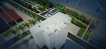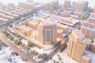 现代简约风格的城市建筑风光,采用与原图相同的细腻纹理、流畅线条和纯净质感,整体配色改为深蓝色与灰色的渐变组合,营造出沉稳而富有科技感的视觉效果,画面保持简洁大气的设计感,没有任何文字或标识元素。