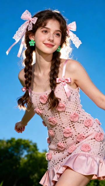 梦幻水彩风插画,甜美少女与苹果树共舞,卡通感与现实交织,超现实主义的童话瞬间。