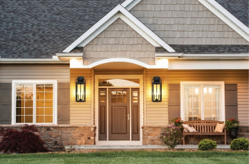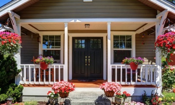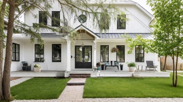 现代简约风格的庭院,阳光明媚的白天,晴朗的蓝色天空点缀着几朵白云,庭院内有一栋两层现代简约风格的白色住宅,住宅外立面有大面积玻璃窗和深色框架,木质大门,门前有几级浅色石阶,周围种植着修剪整齐的绿色灌木、高大的树木和草坪,草坪上有石板小径,整体光影明亮,色彩清新自然,营造出宁静舒适的氛围。
