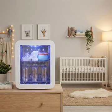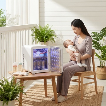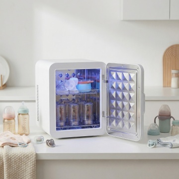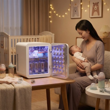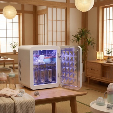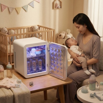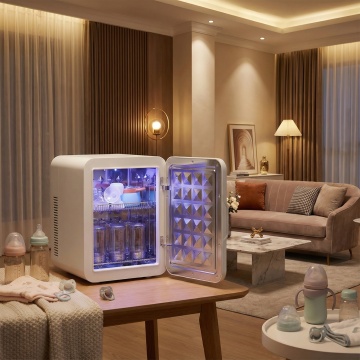 现代感与科技感融合的3D微缩艺术风冰箱,玻璃门内陈列家电,简约主义设计,11.11促销季主题贴纸点睛。