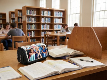 在不改变产品外观、细节、颜色及角度的前提下,请把这个笔袋放在公司办公桌上。