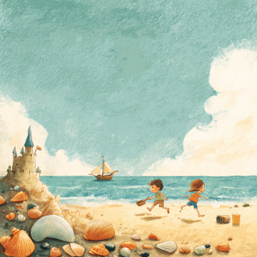 梦幻水彩风插画,童趣沙滩城堡与帆船,清新可爱手账感,印象派笔触渲染夏日海边时光。