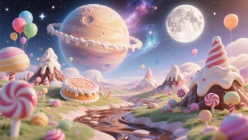 超现实主义风格的冰淇淋梦幻背景,广阔的浅蓝色天空中漂浮着蓬松的白色云朵,阳光明媚,光线明亮柔和,带有轻微的光晕效果。地面覆盖着厚厚的、如同棉花糖般柔软的白色“雪地”,质感轻盈蓬松。前景中,一个巨大的华夫饼冰淇淋蛋筒直立在“雪地”上,蛋筒呈金黄色,表面有清晰的网格纹理,顶部堆叠着粉色和白色相间的螺旋状冰淇淋,顶部是尖尖的粉色奶油,边缘有细腻的奶油质感。周围散落着多个彩色的冰淇淋球,包括一个彩虹条纹的圆形冰淇淋球在前景的“雪地”上。背景中,多个不同口味和装饰的冰淇淋蛋筒漂浮在空中,有的顶部有彩色糖屑,有的是纯蓝色或白色冰淇淋,它们大小不一,分布在画面的不同深度,营造出层次感和梦幻般的空间感。整体色调以蓝、白、粉为主,色彩鲜艳明快,充满童趣和甜蜜的氛围,细节丰富,材质表现细腻,光影过渡自然,呈现出高饱和度、高清晰度的视觉效果。