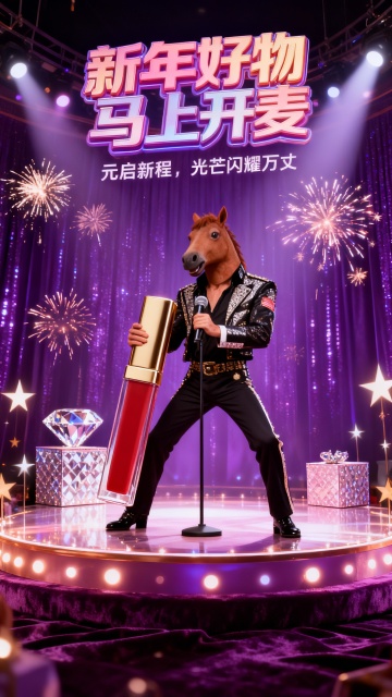 拟人风马头人身角色持巨型唇膏登台,霓虹灯风舞台搭配烟花与钻石礼盒,融合综艺感、奢华感与梦幻感,3D渲染呈现强烈视觉冲击,传递新年喜庆与潮流时尚氛围。