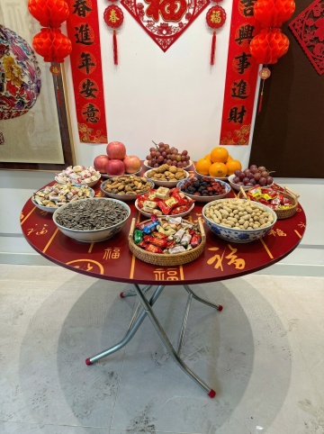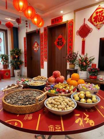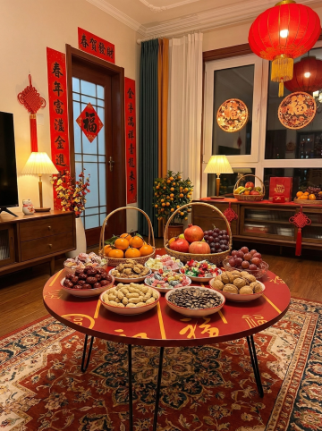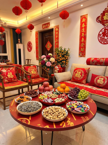 过年喜庆的客厅里摆放着茶几桌子 桌子上摆放着干果和水果