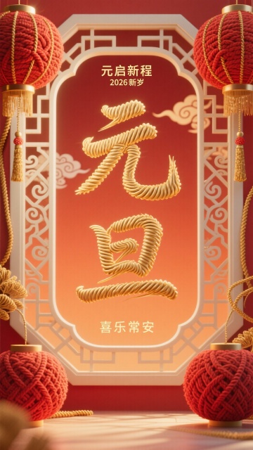 3D绳结肌理字体呈现“元旦”,融合中式窗格与红灯笼,浮雕质感强化喜庆氛围,传递2026新岁吉祥祝福。