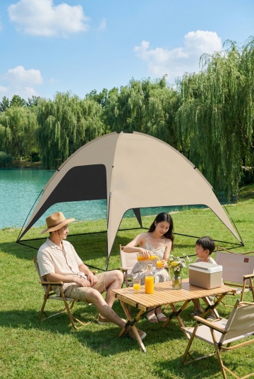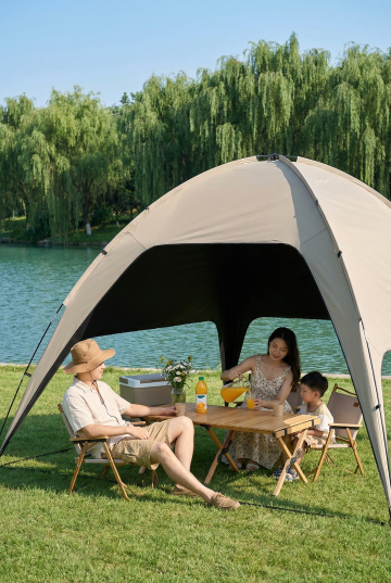 阳光透过茂密的绿色树叶洒下斑驳光影,在开阔的绿色草地上,布置着一个米色帆布帐篷和一个带遮阳棚的露营帐篷,帐篷周围摆放着原木色折叠桌椅,桌上铺着格纹餐布,旁边散落着几个彩色靠垫和一本翻开的书,整体呈现出自然、宁静、舒适的户外露营氛围,高清晰度,写实风格,温暖色调,柔和光线,丰富的细节纹理。
