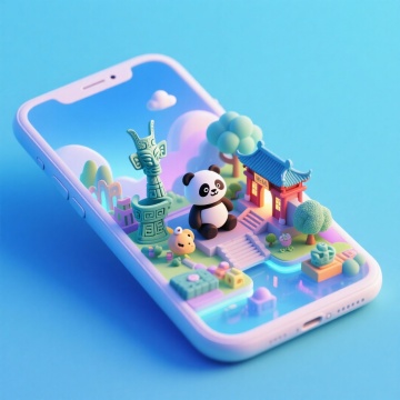 软3D风格的微缩艺术场景,熊猫与传统建筑在手机屏幕上梦幻呈现,融合科技感与卡通感,清新柔和,充满可爱气息。