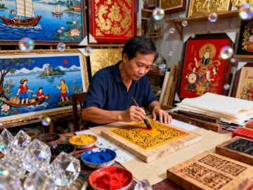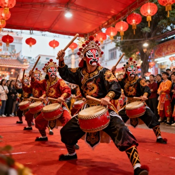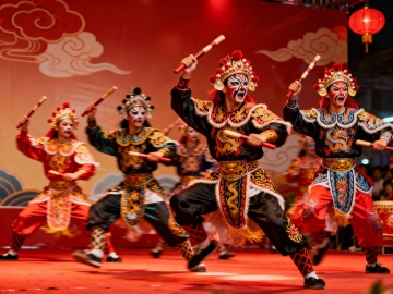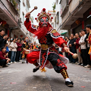 工笔风与刺绣风融合的京剧脸谱墙,以浮雕质感呈现民族与古典韵味,红金蓝三色交织,喜庆热烈,展现中式传统艺术之美。
