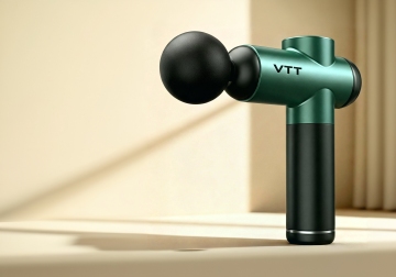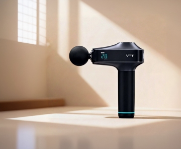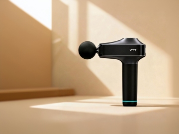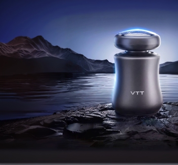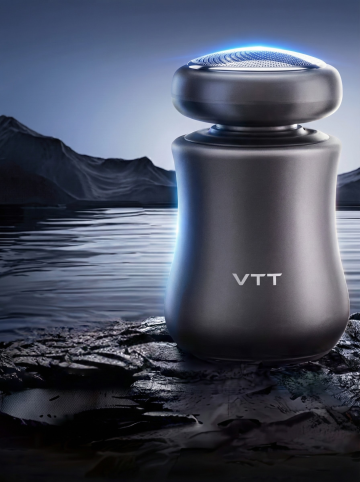 一个现代风格的展台,展台主体为流畅的波浪形结构,整体采用深蓝色与亮橙色的渐变配色,展台顶部有一个白色的手持小风扇,风扇底座为黑色,带有金色的按钮和指示灯,展台放置在光滑的深灰色地面上,背景为渐变的深蓝色,顶部有柔和的白色灯光照射下来,营造出科技感与时尚感兼具的氛围