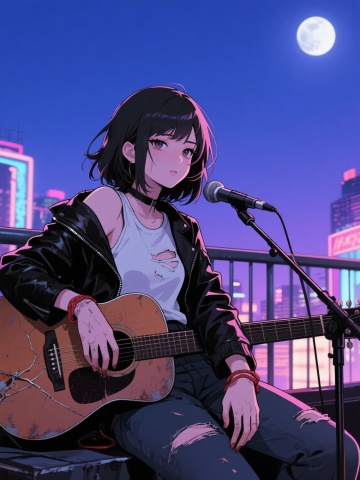 Three young women standing back-to-back on a city rooftop at night, the urban skyline glowing with neon lights (red, blue, purple) behind them. The rain-wet ground reflects blurred lights. The girl on the left wears a delivery uniform, holding a helmet. The one in the center wears a leather jacket, hugging a broken-string guitar. The woman on the right wears a knit sweater, holding a cup of hot water. They look up at the sky, faces lit by distant light. In the distance, urban villages meet skyscrapers. Style: cinematic, realistic, low saturation, high emotional depth, emphasizing female resilience and urban solitude.
