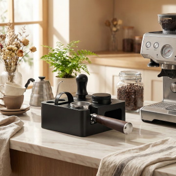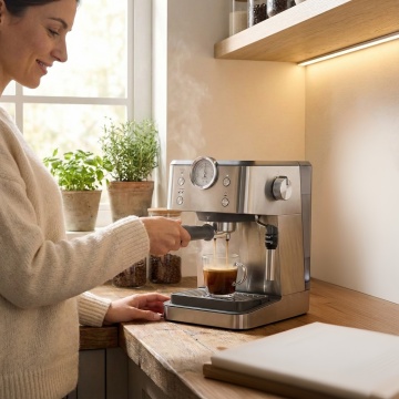 现代感金属风咖啡机,搭配暖黄桌面与绿植光影,融合工业质感与温馨氛围,轻拟物设计展现简约主义美学,传递时尚舒适的生活仪式感。