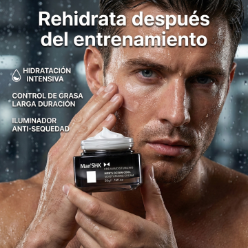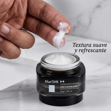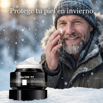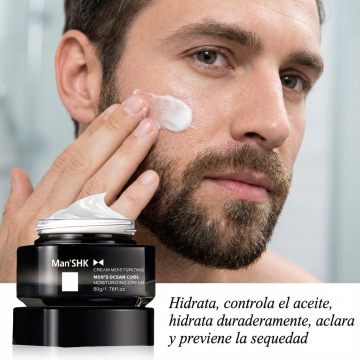 以图中的男士面霜为元素,欧美男人使用面霜,补水控油持久滋润显白,物体主体特征不变,设计6张跟男士面霜有关的图,比例 「1:1」