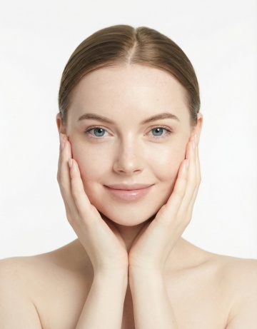 超近特写镜头,聚焦年轻女性的半张面部,细腻展现健康自然的皮肤质感,肌肤呈现出通透的米杏色基调,带有自然的浅棕色雀斑和细微的皮肤纹理,显得真实而有生命力。柔和的自然光从侧上方照射,在眼睑、颧骨和鼻梁处形成细腻的高光,光影过渡自然,立体感强。女性双眼轻闭,长而密的睫毛自然垂下,眉毛呈自然的棕色,形状柔和。唇部微张,唇色为自然的淡粉色,水润饱满。金色的发丝柔软地垂落在脸颊旁,整体氛围宁静、纯净,充满高级感。画面构图简洁,突出皮肤的自然状态和细腻质感,色调温暖柔和,光影运用精妙,展现出皮肤的健康光泽与自然肌理。