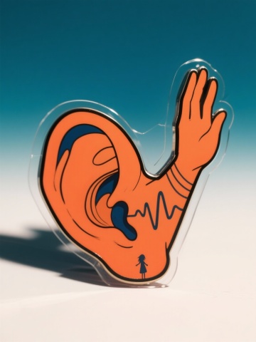 动漫风格:极简风格的徽章设计,主体是一只抽象的耳朵,耳廓由声波线条构成,声波线条逐渐演变成向上托举的手的形状。颜色使用暖橙色(代表希望)与深蓝色(代表沉稳)。背景透明,线条流畅,象征倾听与支持。留白处隐约可见微小的女性剪影。