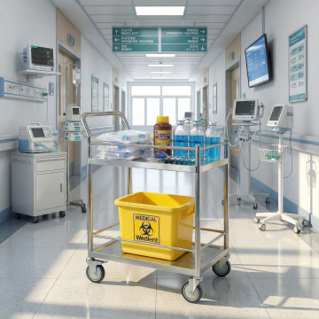 加医疗用品,上层放输液的针管,吊瓶,安瓿瓶,碘伏,下层放黄色没有盖子的防疫垃圾箱