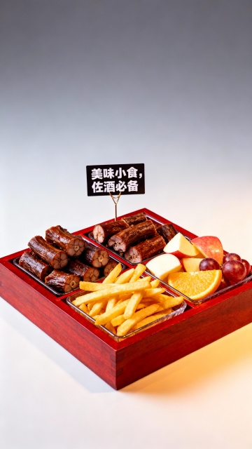 一张摆满各种美味零食的特写照片,展示了丰富多样的零食,包括薯片、饼干、巧克力、水果、坚果、饮料等,它们被精心地摆放在木质桌面上,色彩鲜艳,光影柔和,营造出一种温馨、诱人的氛围,让人垂涎欲滴。