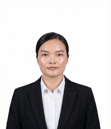 参考图一生成画面:证件照标准样式;保留人物发型和脸型特征,不美颜,外穿奶白米色学院风针织背心,内搭白色翻领长袖衬衫,背心领口有深蓝色、白色和浅灰色条纹装饰;领口处搭配深色格纹领带,淡妆,发丝柔顺有光泽;居中平视正面视角,纯正面,胸部以上半身像;去除一切饰品;光线均匀柔和,画质清晰,表情自然,头部完整,去除人物之外的所有元素,简约白色背景;参考图二的人物占位和比例,严格按照图一的内容生成。
