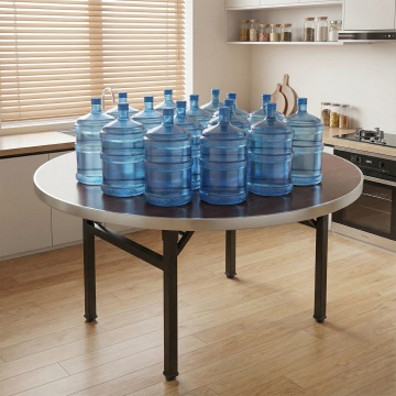“现代简约厨房场景:背景是浅木色百叶窗、白色置物架(摆放调料罐)、厨房灶台等设施;主体是木纹圆形餐桌(边缘饰银色金属包边),桌腿为加粗碳钢交叉支架(黑色,强化稳固支撑感);餐桌表面整齐摆放12桶大容量蓝色桶装水,桶装水摆满了桌面;整体光线明亮通透,色调清新整洁,超高清渲染,突出桌面的厚实质感与支架的稳固结构,营造实用耐用的居家厨房氛围”