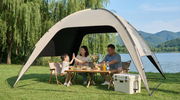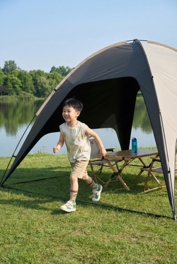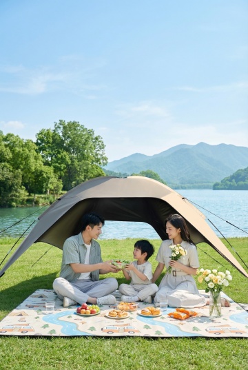 使用参考图中的天幕生成一张高清拍摄风格的户外场景图: 1. 场景:夏日晴朗午后,湖边翠绿草坪(背景是平静的蓝绿色湖水+岸边茂密垂柳+蓝天) 2. 主体:浅卡其色拱形天幕帐篷(内侧黑色)下的年轻家庭野餐 3. 人物细节: - 男士:戴浅棕色宽檐草帽,穿浅米色短袖衬衫+卡其短裤,坐折叠椅上,神态放松 - 女士:穿浅色碎花吊带连衣裙,正在向杯子倒橙汁 - 小男孩:坐在椅子上等待&果汁 4. 物品细节:折叠木质小桌(放保温箱、橙汁瓶、小花瓶)、折叠帆布椅、 5. 风格与氛围:明亮清新色调,自然柔和光线,温馨治愈的生活感,画面高清细腻、色彩饱和度适中。整体为一家三口在参考图中的天幕下遮阳野餐,主体为参考图中的天幕,不要改变天幕的形状,要能看到天幕的整个主体