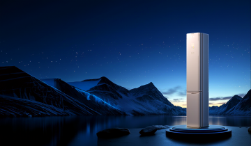 俯视角构图,一台棱角分明的哑光白前置式滚筒洗衣机,舱门以30度角优雅敞开,露出内部如镜面般光滑的银色不锈钢内筒,圆形观察窗折射着柔和的光线,控制面板上的旋钮与按键泛着细腻的金属光泽,机身侧面的竖直线条纹理在斜射光下形成深浅交替的光影韵律,洗衣机静置在带有细微纹理的水磨石台面上,投下柔和而富有层次的倒影,背景是渐变的雾蓝与珍珠白的交融,一束来自左上方的柔光恰好勾勒出洗衣机的轮廓,创造出微妙的高光与阴影过渡,突出哑光白机身的纯净质感与金属部件的精密光泽,整体氛围呈现出极简主义的高级感与科技产品的冷静美学。