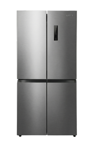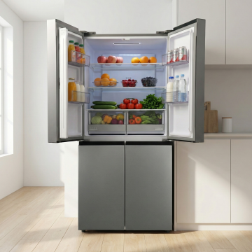 极简主义风格的白色双门冰箱位于画面中央,保持其原有形态与设计细节。冰箱周围环境改为温馨明亮的北欧风厨房一角,浅灰色木纹地板延伸至墙面,墙面采用柔和的米白色。冰箱右侧是原木色一字型橱柜,台面整洁,摆放着透明玻璃罐,内装杂粮与意面。橱柜上方悬挂着简约白色搁板,放置几只白色陶瓷碗碟。左侧靠近冰箱处有一盆大型龟背竹绿植,叶片舒展自然。画面左下角放置一把金色金属框架的餐椅,搭配浅灰色布艺坐垫。整体采用自然光线下的柔和光影,色调清新明快,营造出简约舒适的居家氛围,构图保持对称平衡,视觉焦点集中于冰箱主体,细节丰富且具有生活气息。