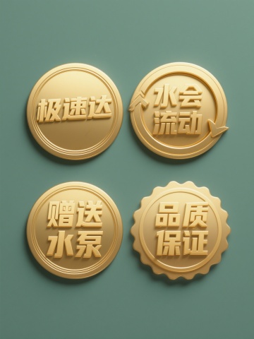 金色浮雕徽章,融合奢华金属质感与3D重拟物设计,彰显科技与商务格调,传递品质承诺与高效服务理念。