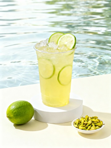 生成一个简约清新的柠檬茶展示背景,简约的场景,水波荡漾的背景空间,柠檬茶杯子款式参考图片,杯子在底座之上,搭配一个新鲜的青柠檬作为展示,一小碟茶叶配饰要配合茶底的不同的口味而变化;清新的颜色,给人一种新鲜水果的感觉,分别生成适合锡兰红茶柠檬茶,栀子绿茶柠檬茶,茉莉绿茶柠檬茶的场景图各一张。图片尺寸是3543X4724像素。