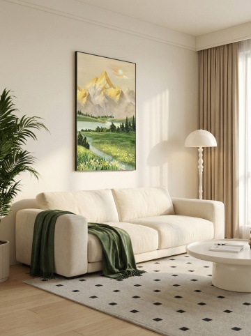 明亮柔和的自然光洒满整个空间,采用极简北欧风格设计,以米白色、浅木色和原木色为主色调,温暖而治愈的氛围。画面中展示的是一个变换了不同家具环境的客厅,整体构图保持对称美学与开放式布局,光线从左侧窗户斜射进来,在浅色木地板和条纹地毯上形成清晰的光影层次。墙上挂着两幅简约线条的植物装饰画,搭配原木边框。左侧有一盏弧形黄铜落地灯,灯光柔和,旁边摆放着一盆绿植。中央是一张浅灰色布艺沙发,搭配几个不同纹理的浅色系靠垫,沙发前是一张原木色茶几,上面整齐摆放着几本书籍和一个小巧的陶瓷花瓶。整体画面质感细腻,线条简洁流畅,空间通透,营造出舒适、宁静且温馨的居家氛围。