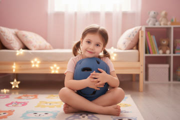 保持产品不变的情况下,材质细节不要变 浅暖橘壁灯的光浸满整个房间,米色短绒地毯铺在地板上,橙色小帐篷搭在角落,帐篷边倚着浅蓝毛绒抱枕,原木小桌上摆着橙白拼色的积木盒 —— 金发外国小男孩 Owen 穿着浅橙卫衣,盘腿坐在地毯中央,身边的米白灰棕毛绒小马全程 “黏人又鲜活”。