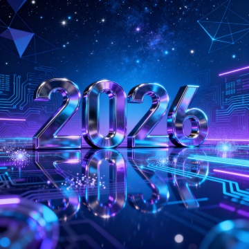 未来感十足的2026年视觉设计,融合赛博朋克风与霓虹灯元素,金属质感数字在3D空间中闪耀,搭配电路板纹理与星河背景,营造出科技感与光影感交织的节日氛围。