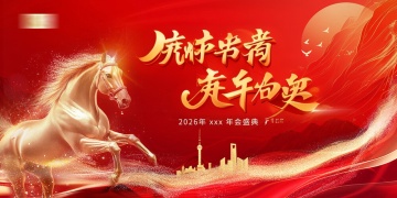 企业2026马年年会主题海报,深邃红色渐变背景,叠加微光粒子效果,左下角有抽象化的奔腾骏马,四蹄踏金色光浪奔腾向前,融入科技感光影线条,极简现代风格,兼具正式感与视觉冲击力,骏马象征企业开拓进取,光浪代表发展势能,红金配色传递庆典喜庆与商业高级感